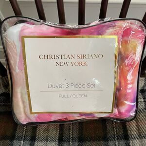 New in package, Christian Siriano New York, full/queen duvet, three-piece set, including one duvet cover, 92“ x 96“ and two shams that measure 20“ x 26“. 100% cotton. The large scale bouquets floral pattern uses shades of purple pink, peach and teal for a bright and fresh look on soft 200 thread count cotton sateen woven.