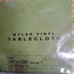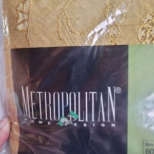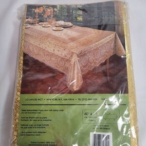 New in package Gold Mylar Vinyl Tablecloth. Lace Pattern. Oblong 60" by 104". Metropolitan Home Design.