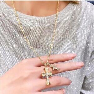 Elegant gold cross pendant necklace with sparkling details. Perfect for adding a touch of sophistication to any outfit.