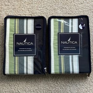 New in packaging, never opened! Lot of 2 NAUTICA standard size pillow shams, in the highly sought after LAKEVIEW pattern. Each sham measures 20' x 26". Comprised of 100% cotton. Stored in a smoke free environment.
