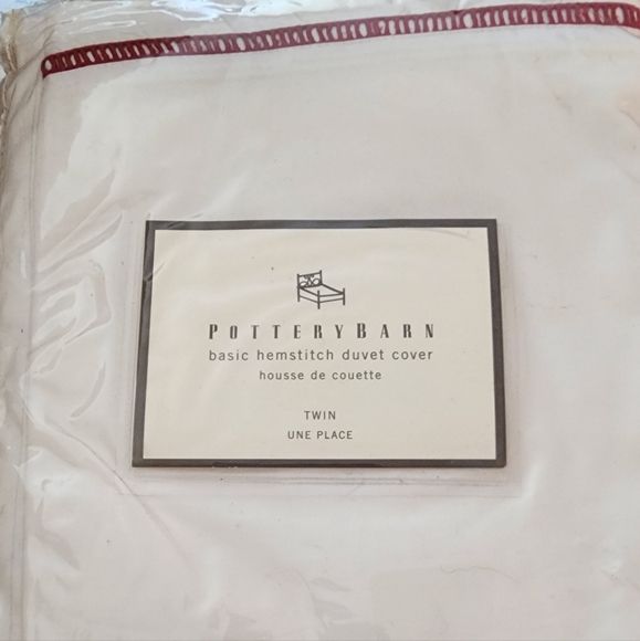 New in package. Pottery Barn Basic Hemstitch Duvet Cover - Twin. White with red hemstitch...perfect for the holidays! 100% cotton. Machine washable. Made in China.