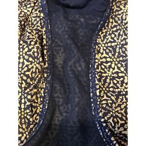 Fun, nautical navy with a cool geo print with gold foil detail. Molded cups, flattering twist front, adjustable straps. Multi-cup fits a variety of bust sizes comfortably! This suit is absolutely amazing! Excellent condition. Clean inside and out!