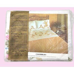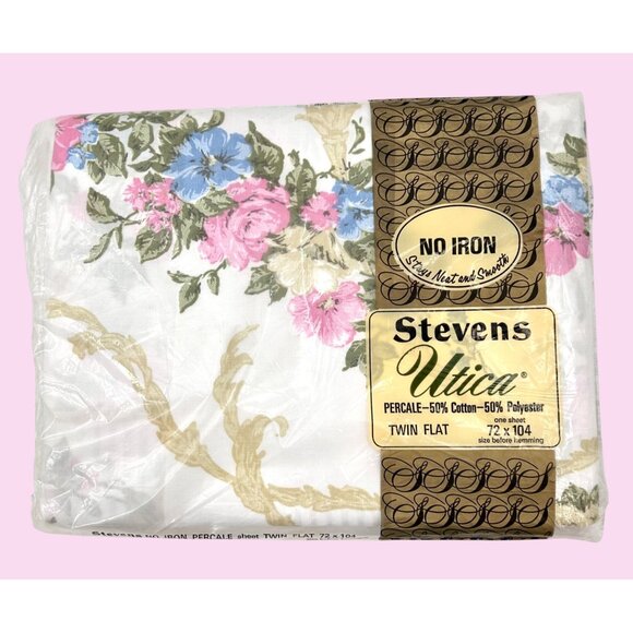 Vintage, new in package No Iron Stevens Utica Canterbury twin flat sheet. A durable and low-maintenance twin flat sheet with a classic pink & blue floral design. Blends comfort and style with a no-iron feature for convenience.