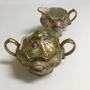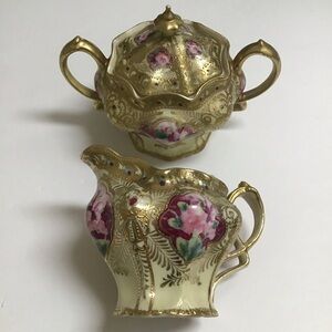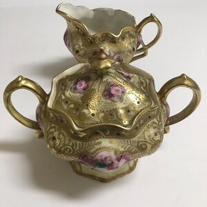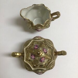 NIPPON Japan Porcelain Sugar Bowl Lid & Creamer SET Gold Gilt Moriage Pink Roses