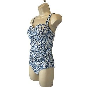 This two-piece swimsuit from Nip Tuck comes in a beautiful Petal Plunge print with shades of blue and white. The top is a Joanne Tankini style with adjustable straps and a twist front that provides multifit cup support, fitting C to D cup sizes. The set includes a bikini bottom and is made of 85% Nylon and 15% Spandex, with a fully lined and Powernet lined front. To keep this swimsuit looking great, it is recommended to hand wash cold. Perfect for the beach or pool, this set has a beach/pool theme. The Nip Tuck brand is known for their quality swimwear and this set does not disappoint. gently used preowned condition