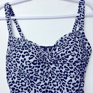 NipTuck Swim Joanne one piece swimsuit with tummy control for a flattering look. Twist front, ruched side design. Multi fit padded cups for shape & Support. Adjustable shoulder straps. Body contouring powermesh. Fully lined. Gray leopard allover print.