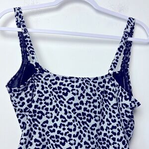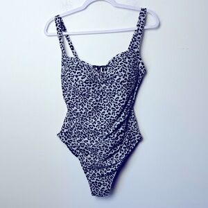 NipTuck Swim Joanne one piece swimsuit with tummy control for a flattering look. Twist front, ruched side design. Multi fit padded cups for shape & Support. Adjustable shoulder straps. Body contouring powermesh. Fully lined. Gray leopard allover print.