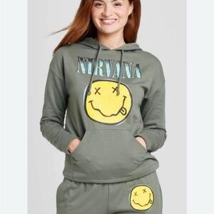 Cozy Nirvana hoodie for kids. Features iconic smiley face in yellow and blue. Comfortable and stylish.