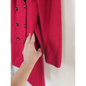 This NISHE Red Double Breasted Wool Coat is a stylish and classic choice for the colder seasons. The mid-length coat features a removable black faux fur trim collar, adding a touch of elegance and warmth. With a solid red color and a double-breasted button closure, it exudes a designer, city-chic vibe perfect for a casual yet sophisticated look. The wool blend fabric, acetate lining, and synthetic insulation make it ideal for winter, fall, or spring, while the size 4 fits a regular women's size. The coat also includes practical features like pockets and a collared neckline.