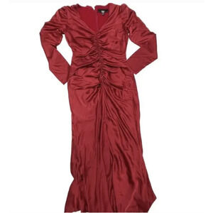 NISSA Dress Womens Small Red Satin Ruched Long Sleeve V Neck Midi Cocktail Party