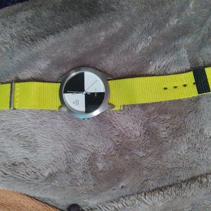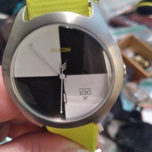 Yellow Band with Black & White sectors split into 1/4s. Showing off the look of this fine Nixon 100M, Modern Sports Watch.