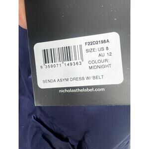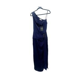 NIcholas Satin Senda Asymmetric Ruched Gown Midnight Blue Size 8 NWT