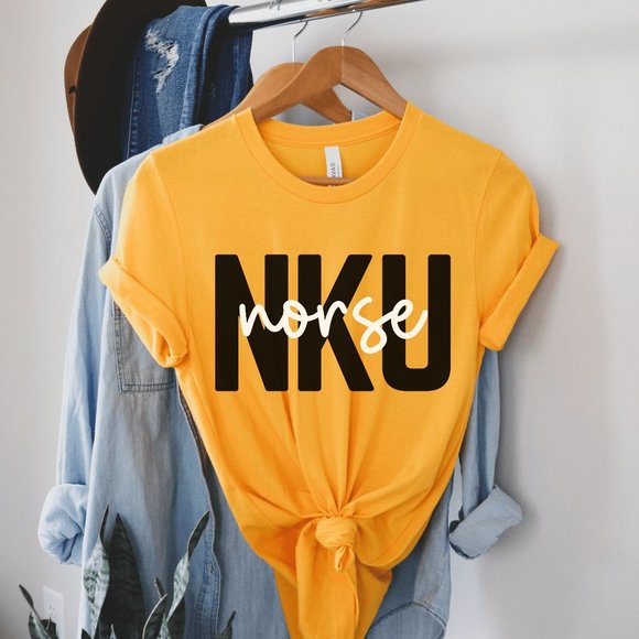 **Show your Norse pride in style! Order your Bella Canvas 3001 NKU Norse T-Shirt in XL gold today and enjoy both comfort and team loyalty in a standout piece.**