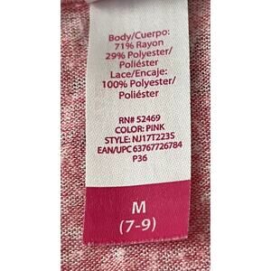 Body: 71% Rayon, 29% Polyester; Lace: 100% Polyester; Recommended on Tag: Machine wash cold gentle, tumble dry low