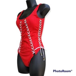 NO BOUNDARIES Juniors' Lace Up One Piece Swimsuit Red with White Laces Size 7-9.