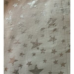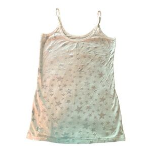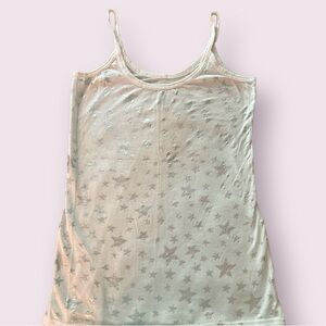 Cute tank, versatile, awesome for summer weekends or vacation! Size Large, all cotton, white with multi sized silver metallic-look stars. Spaghetti straps. Nice condition!
