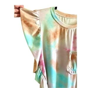 NO BRAND, NWOT, GREEN/PINK/TAN, TIE DYED SHIRT. RUFFLED CAP SLEEVE. SOFT, COMFORTABLE FABRIC. NO SIZE.