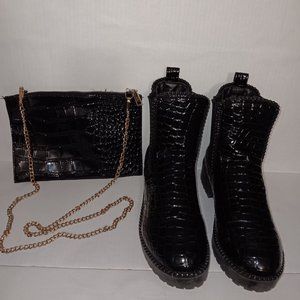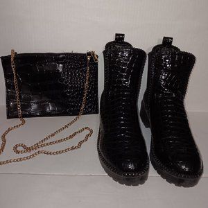 NO DOUBT PATENT LEATHER CROC PRINT BOOTS & HANDBAG