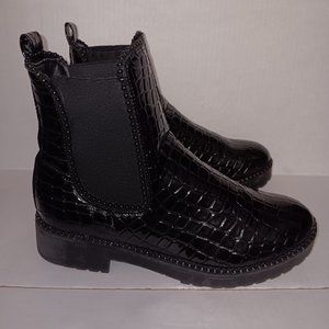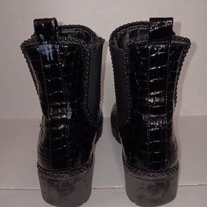 Size 7 Women's - No Doubt patent leather croc print boots and unbranded patent leather croc print shoulder strap handbag with gold tone strap both are in pre-owned condition and have signs of wear