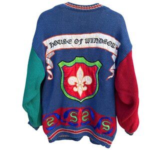 Show your royal allegiance in this bold knit cardigan featuring a House of Windsor crest and vibrant embroidery. Perfect for those who prefer their fashion loud and unapologetic.