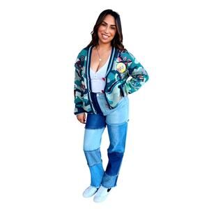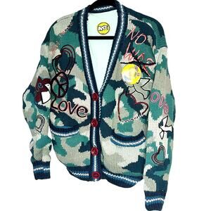 A statement-making NO! Jeans “World Peace” Cardigan featuring a green camo knit base detailed with embroidered peace motifs, heart appliqués, and contrasting slogans like “No War” and “Love.” Red heart-shaped buttons and ribbed striped trim complete the playful yet bold aesthetic.