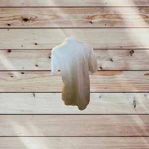 THIS IS A GREAT SHIRT SIZE MEASURE AT A MEDIUM. I DO NOT SEE ANY STAINS OR HOLES ON IT. PIT TO PIT IS 20 INCHES AND 24 INCHES GOING DOWN.