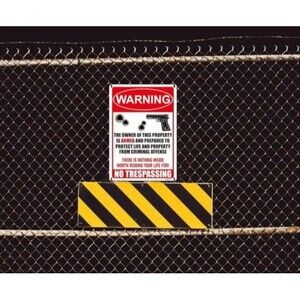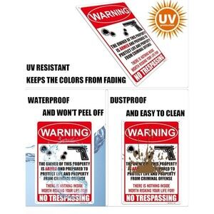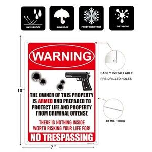 Brand new NO TRESPASSING Sign Armed Home Owner Aluminum Sign Metal 10"x7" Ready to Hang. Can be attached to fence or wall. Sign has holes in all 4 corners and is ready to hang. Sign says, "Warning The owner of this property is armed and prepared to protect life and property from criminal offense. There is nothing inside worth risking your life for! No trespassing.
