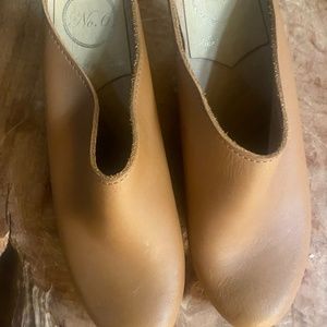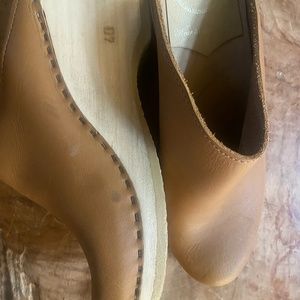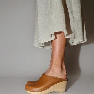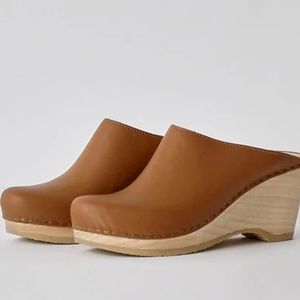 Sleek, closed toe clog slide on wedge heel. Warm tan leather upper. Rounded toe, open back, and minimal stitching. Lightweight, lacquered wood base. Unlined.