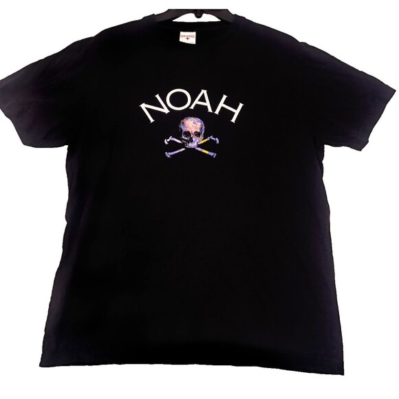 Authentic NOAH mens medium black Tshirt featuring bold vertical NOAH lettering over a stylized skull with crossed baseball bats. Tagged as 100% recycled cotton and Made in USA, this tee is a great pick for fans of streetwear brands and sustainable apparel.