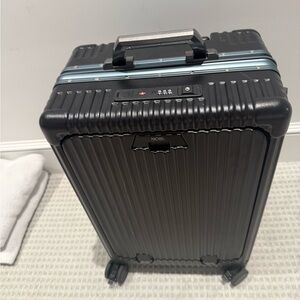 Sleek black hard shell suitcase with wheels. Durable and stylish for travel.