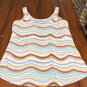 Vibrant tank top with wave patterns. Features blue, orange, and cream colors.