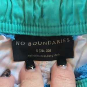Stylish swim or everyday shorts by NOBO with lined side pockets and one rear button pocket minus button... with a vibrant blue and pink skull and palm leaf covered design. Perfect for beach/school pool/skip days.