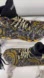 Bold high-top sneakers with a dynamic black and yellow pattern. Designed for style and comfort. Ideal for casual wear.