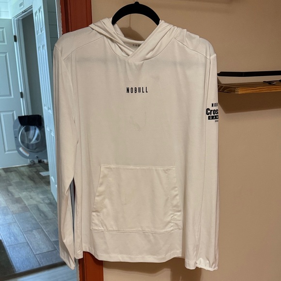 Sleek white NOBULL hoodie with front pocket. Features logo on chest and sleeve.