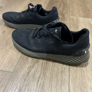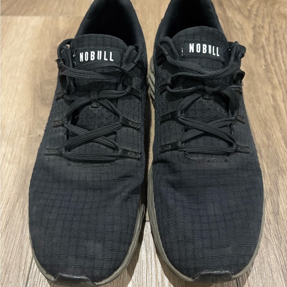 Sleek black sneakers by NOBULL. Army green/gray soles. Ideal for fitness and everyday use.