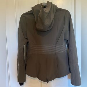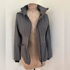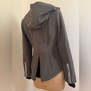 This stylish lightweight short jacket is sold out online and is the perfect layer for the equestrian lifestyle. This jacket features a removable hood and flattering stitching along the waist. Very modern design that is hard to find.
