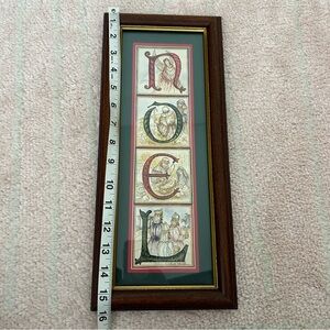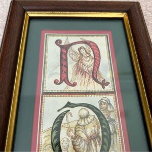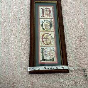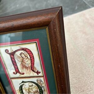 Beautiful Noel Art Print depicting the Nativity. Brown and gold frame. Green matte. A few minor scuffs on the frame (Shown in photos). Perfect Christmas Art. Made in the USA