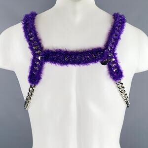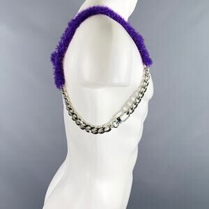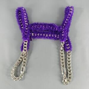 NOIR KEI NINOMIYA FW22 harness in a silver tone metal featuring a bulldog harness style with chain link, fuzzy purple faux faur design, and clasp closure. Made in Japan.