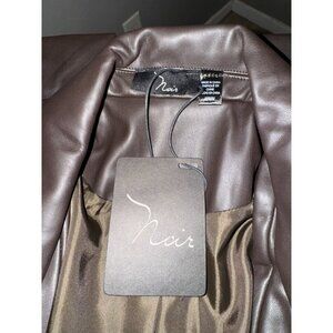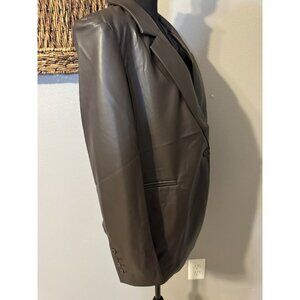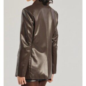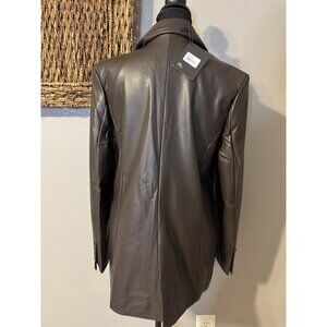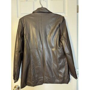 This suit jacket/blazer is from Noir in a women's size medium.  Dark brown in color, vegan leather.  Single breasted with brown buttons.  HIp pockets are still sewn shut.  Has a single breast pocket (still sewn shut also). Four buttons on the sleeve cuffs.  Fully lined.