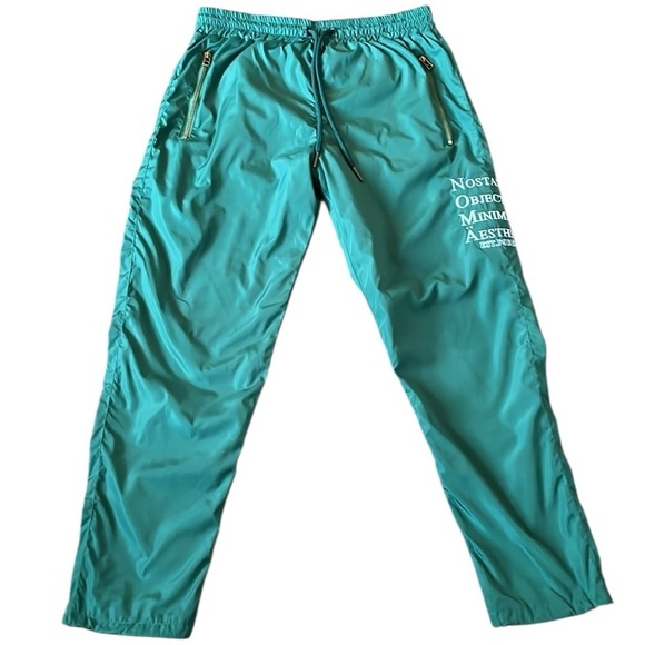 NOMA T.d. Green Pants Size Medium “Nostalgic Objective Minimal Aesthetic”Relaxed Fit, Lightweight and Sporty. Featuring Gold Two Side Pockets w/ Gold Zipper, Thick Elastic Waist Band w/ Drawstring & Cinched Ankle Drawstrings.