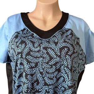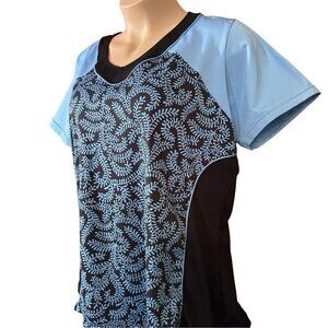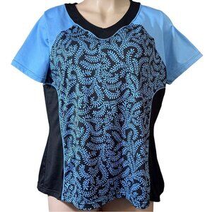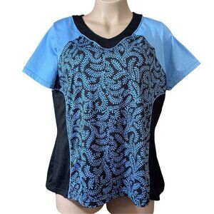 NONIA ~ Women's thick, luxe pullover activewear top. Size 2X. Black and turquoise print. V-nck. Short sleeves. Rounded bottom. Double layer mesh sides.