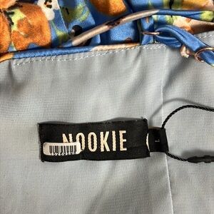 NOOKIE 70s Floral Satin Sleeveless Ruched Cutout Asymmetric Ruffle Maxi Dress L