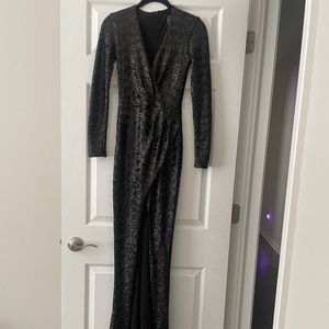 Exquisite sequin gown with a plunging neckline and wrap front, revealing a sexy thigh split. This amazing red carpet look is made from an all over sequin and has an invisible zipper down the centre back.