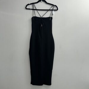 midi with fine elastic straps that can be worn two ways. First as a cross over with gold link at collarbone, or cross back with gold link at back. Invisible zip at back. Crafted in our form fitting scuba crepe, fully lined