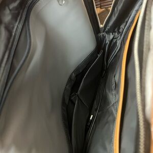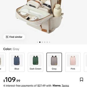 Sleek gray backpack with tan accent details. Designed for daily carry with multiple zip pockets and a clean, modern look. Lightweight, durable fabric for everyday use. Neutral gray pairs well with professional and casual styles. USB charger inside. Airport and travel friendly with luggage strap.