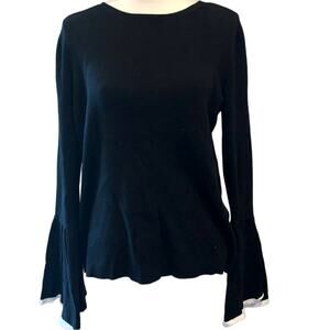 From Nordstrom's Halogen line, this is a bell-sleeve soft knit crewneck sweater in all black with a line of white knit trim at the wrists.