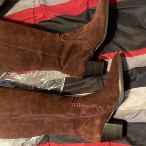 THESE ARE NIB, STILL WRAPPED BOOTS PURCHASED FROM NORDSTROM DEPARTMENT STORE! THEY ARE A RICH COCOA COLOR COW SPLIT SUEDE! THE STYLE IS "SO-ALEXIE". THEY COME TO THE KNEES WITH A WOOD HEEL OF APPROX 2-1.4 INCH. THEY HAVE A DETAILED STITCH STYLE ACROSS THE FRONT OF THE BOOT A DETAILED SCALLOPING AT THE TOP. THEY ARE SIDE ZIP UP BOOTS.
