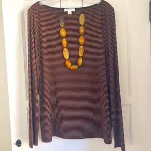 Color: Rust and Black (maybe Navy Blue?) mini stripes. I photographed the top with a navy blue sweater to show it's versatility