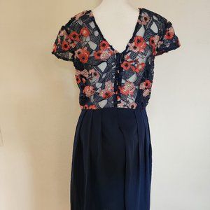 NORDSTROM V-NECK CROCHET MIDI DRESS - NAVY - SIZE 8
