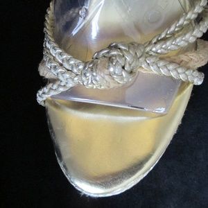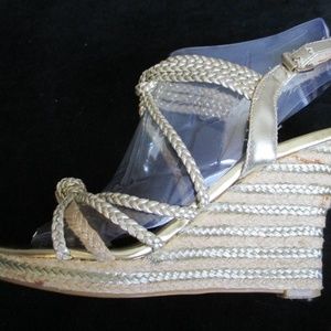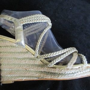 golden man made faux leather braided straps are mixed with jute....buckle and gold and jute covered wedge heel espadrilles (3.75")...some minor marks from wear,otherwise excellent condition..size: 6.5 b